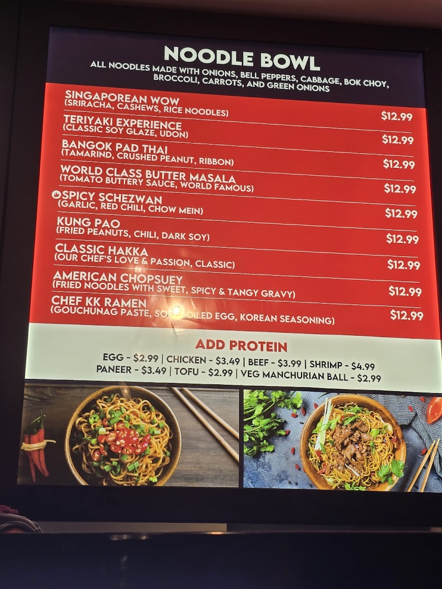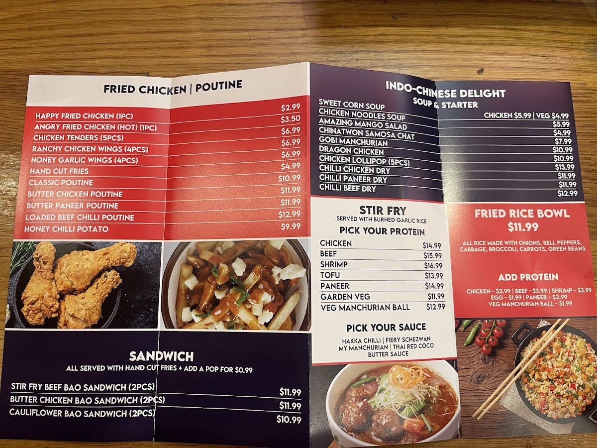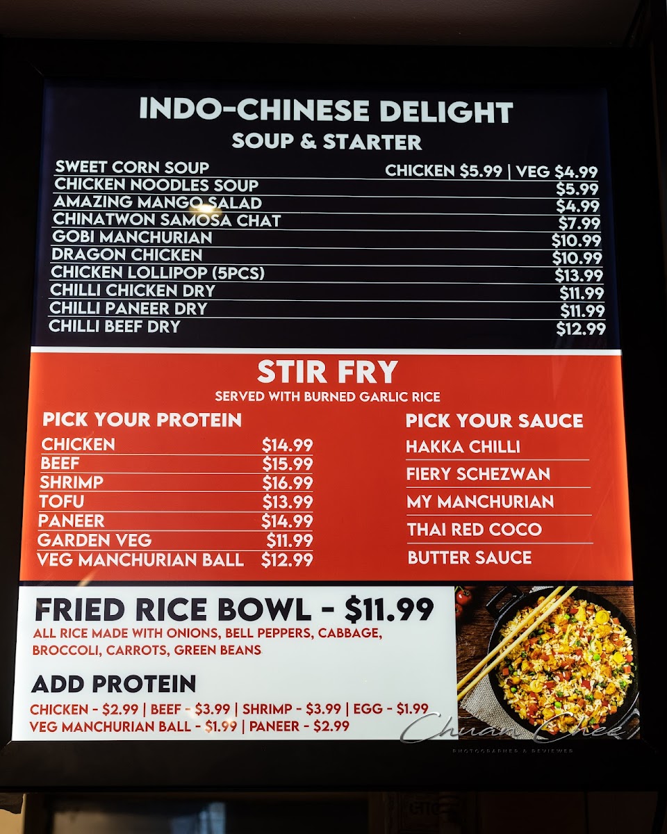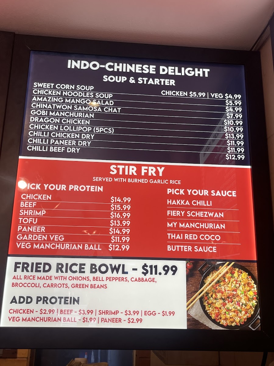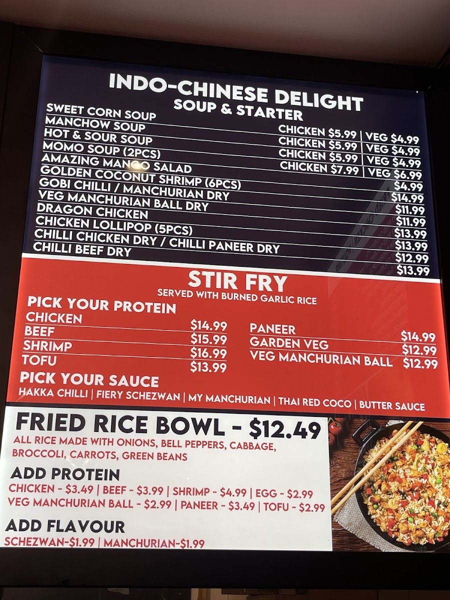 There are several soup options, including sweet corn and Manchow soups, ideal for light meals or starters. The menu also offers unique fusion items like butter chicken poutine and stir-fried curry variations.